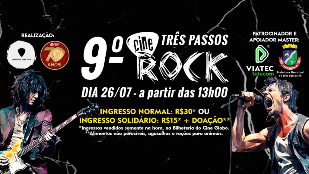 Prepare-se para viver a energia do rock ao vivo na 9ª edição do Cine Rock Três Passos, um dos maiores encontros musicais da região! O evento acontece no dia 26 de julho, a partir das 13h, reunindo bandas, cultura e solidariedade em um só lugar.