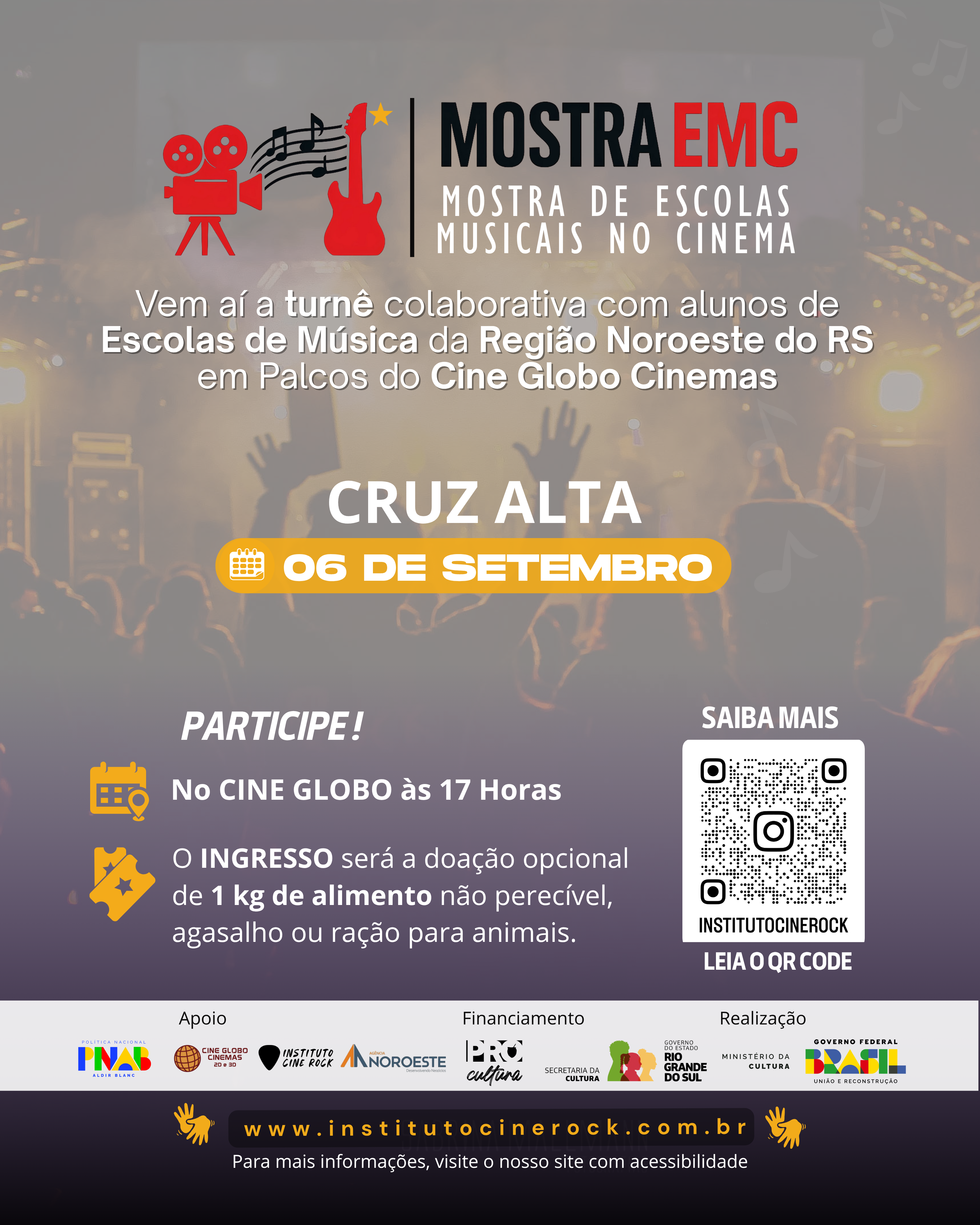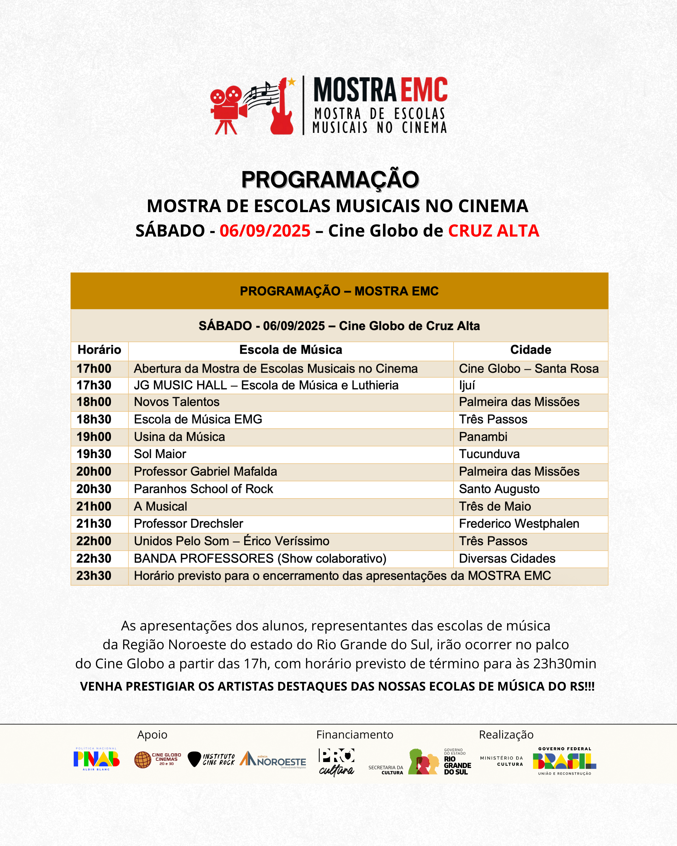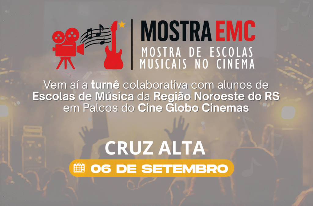 A cidade de Cruz Alta será palco da próxima edição da Mostra EMC – Mostra de Escolas Musicais no Cinema, neste sábado, 06 de setembro, no Cine Globo Cinemas, a partir das 17h. O evento promete reunir alunos e professores de diversas cidades da região Noroeste, em um espetáculo que valoriza a educação musical e o talento local.